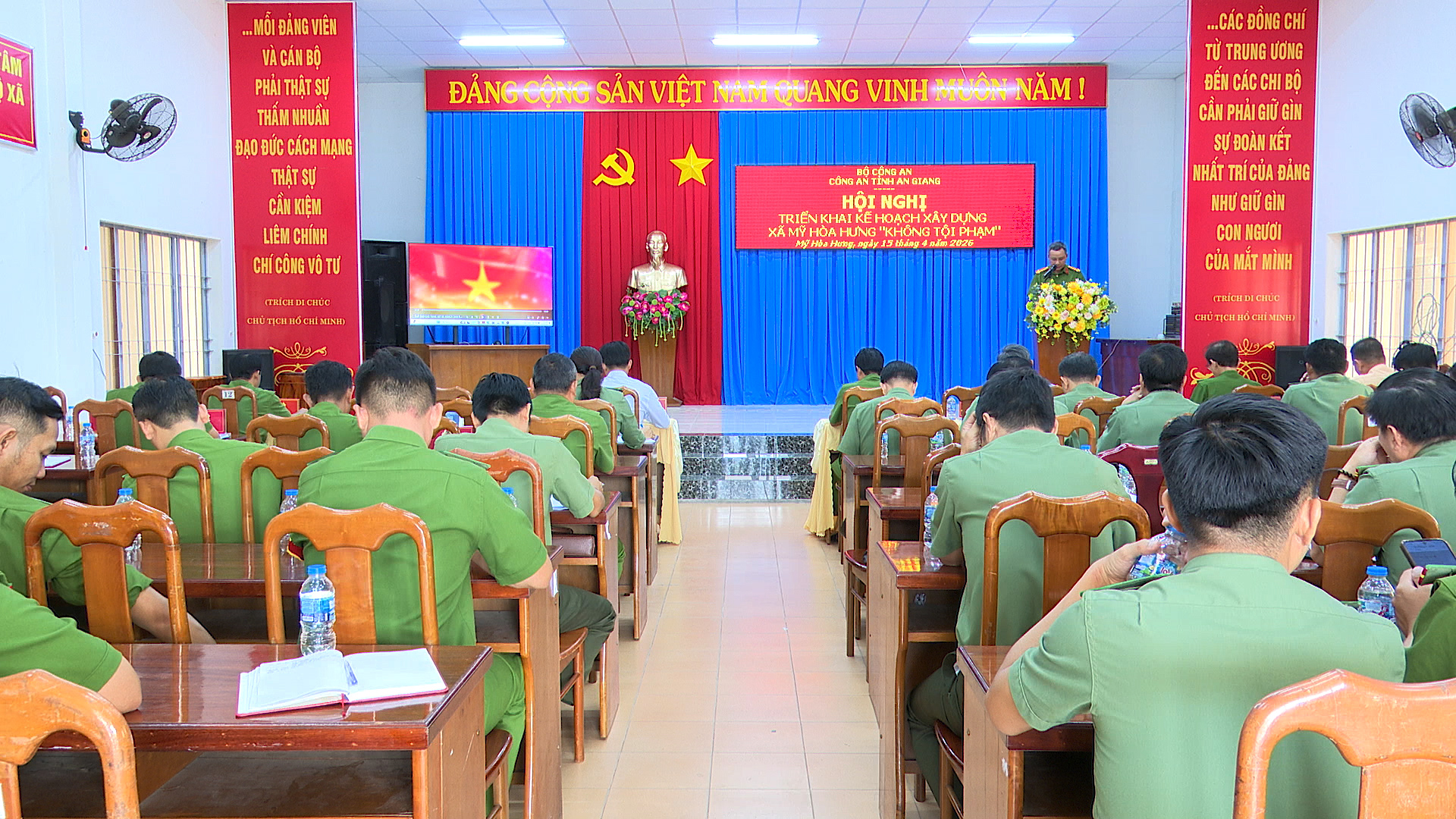 Sáng ngày 15/4/2026, Công an tỉnh An Giang tổ chức Hội nghị triển khai Kế hoạch xây dựng xã “không tội phạm” trên địa bàn xã Mỹ Hòa Hưng. Đây là hoạt động có ý nghĩa thiết thực nhằm tăng cường công tác đảm bảo an ninh, trật tự, hướng tới xây dựng môi trường sống an toàn, bình yên cho Nhân dân.
