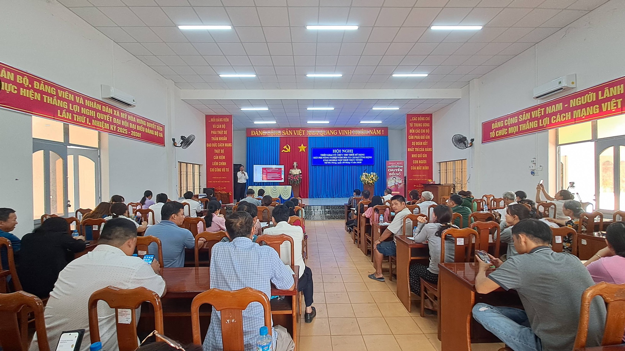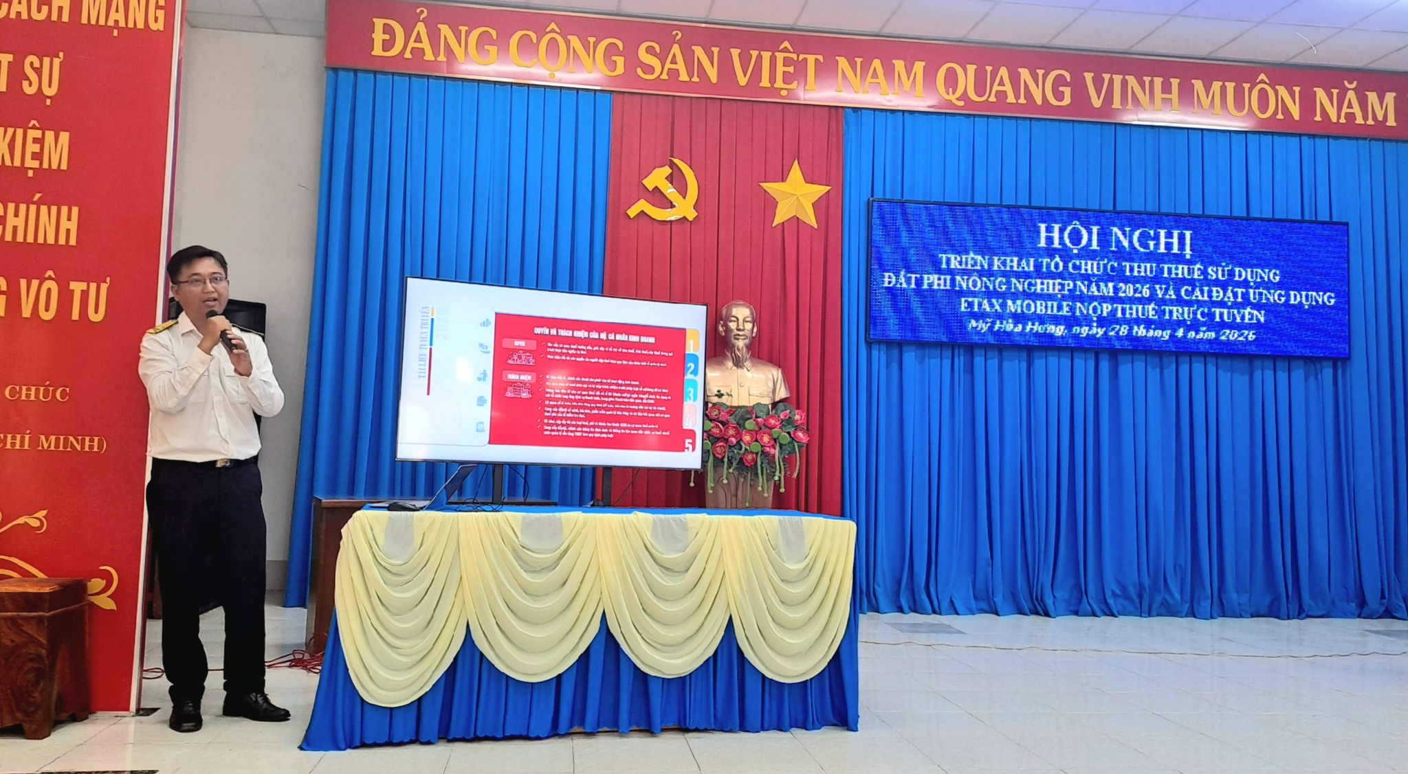 Sáng ngày 28/4/2026, tại Hội trường UBND xã Mỹ Hòa Hưng đã diễn ra Hội nghị triển khai tổ chức thu thuế sử dụng đất phi nông nghiệp năm 2026 và hướng dẫn cài đặt, sử dụng ứng dụng Etax Mobile nộp thuế trực tuyến.