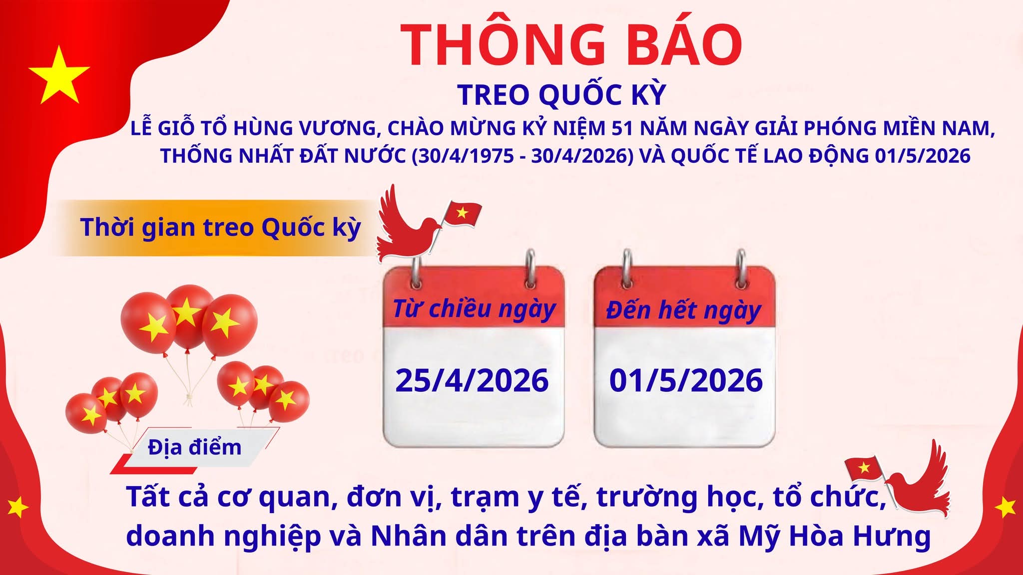 Hướng tới kỷ niệm các ngày lễ lớn của đất nước, nhằm tạo không khí trang trọng, thiêng liêng và cổ vũ tinh thần đoàn kết trong Nhân dân, Ủy ban nhân dân xã Mỹ Hòa Hưng thông báo về việc treo Quốc kỳ nhân dịp Giỗ Tổ Hùng Vương, Ngày Chiến thắng 30/4 và Ngày Quốc tế Lao động 01/5 năm 2026 như sau: