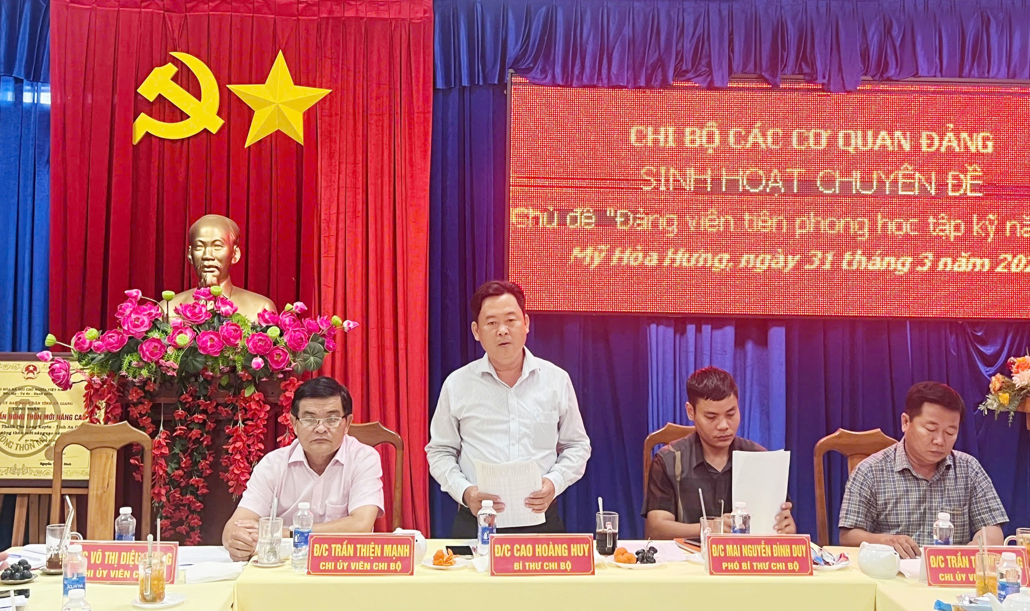 Sáng ngày 31/3/2026, tại Hội trường Đảng ủy xã Mỹ Hòa Hưng, Chi bộ các cơ quan Đảng đã tổ chức sinh hoạt chuyên đề quý I/2026 với chủ đề “Đảng viên tiên phong học tập kỹ năng số”. Hội nghị do đồng chí Cao Hoàng Huy – Phó Bí thư Thường trực Đảng ủy xã, Bí thư Chi bộ các cơ quan Đảng chủ trì.