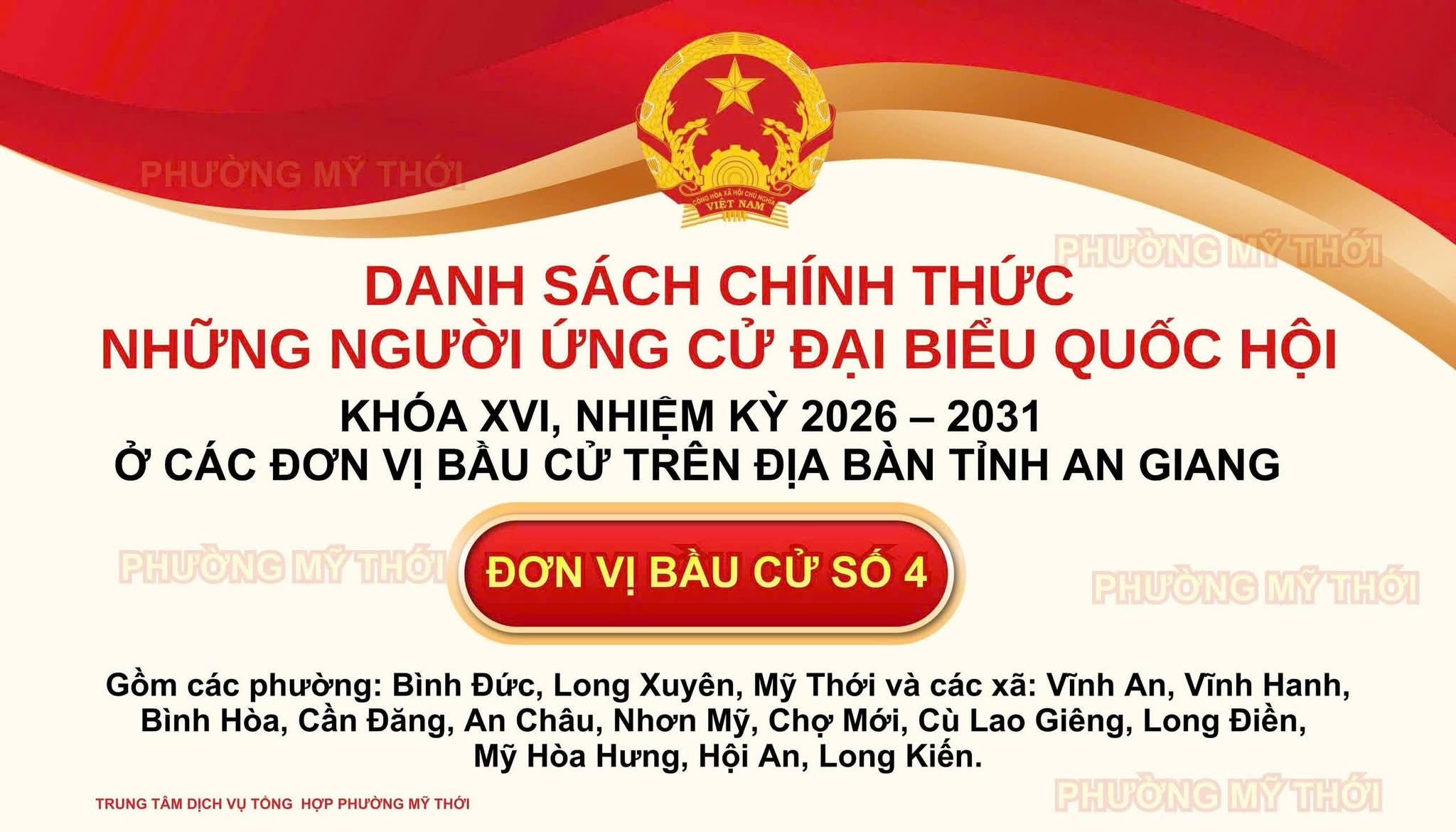 Trong đó, Đơn vị bầu cử số 4, gồm các phường: Bình Đức, Long Xuyên, Mỹ Thới và các xã: Vĩnh An, Vĩnh Hanh, Bình Hòa, Cần Đăng, An Châu, Nhơn Mỹ, Chợ Mới, Cù Lao Giêng, Long Điền, Mỹ Hòa Hưng, Hội An, Long Kiến.