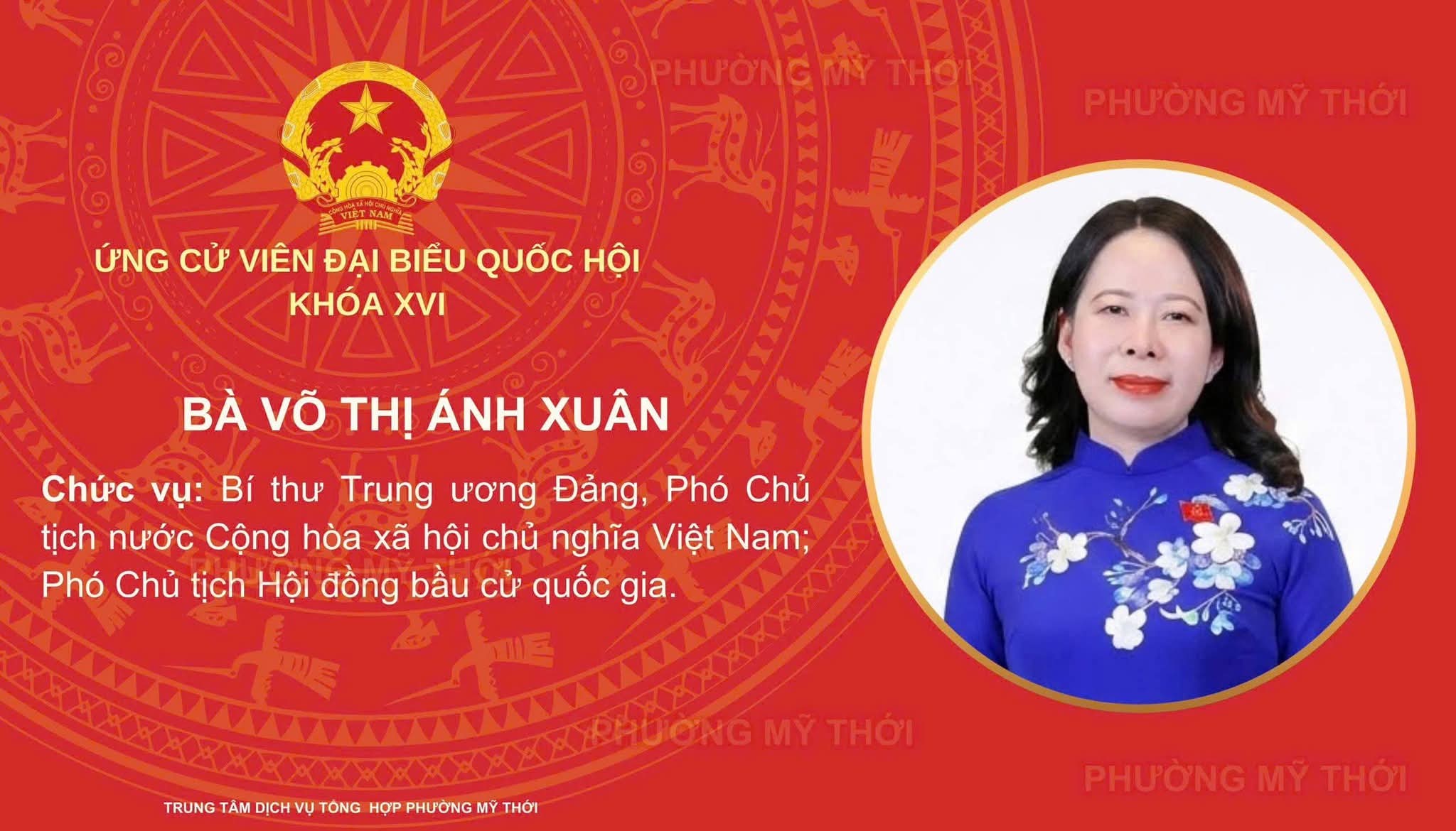 5. Bà Võ Thị Ánh Xuân - Bí thư Trung ương Đảng, Phó Chủ tịch nước Cộng hòa xã hội chủ nghĩa Việt Nam; Phó Chủ tịch Hội đồng bầu cử quốc gia.