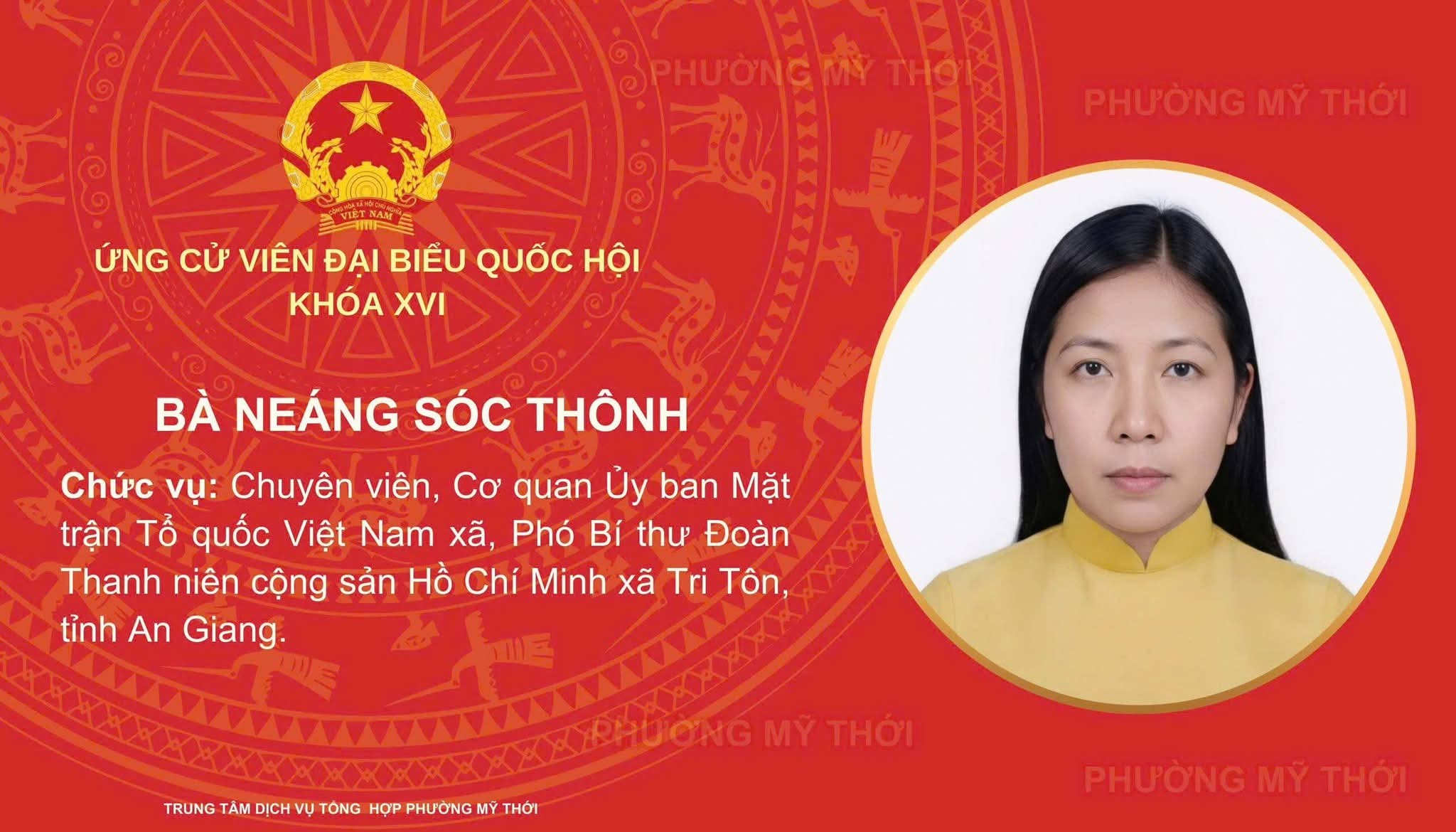2. Bà Neáng Sóc Thônh - Chuyên viên, Cơ quan Ủy ban Mặt trận Tổ quốc Việt Nam xã, Phó Bí thư Đoàn Thanh niên cộng sản Hồ Chí Minh xã Tri Tôn, tỉnh An Giang.