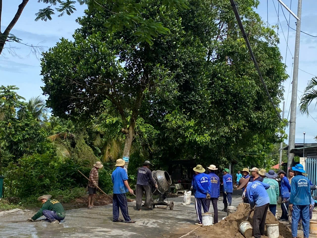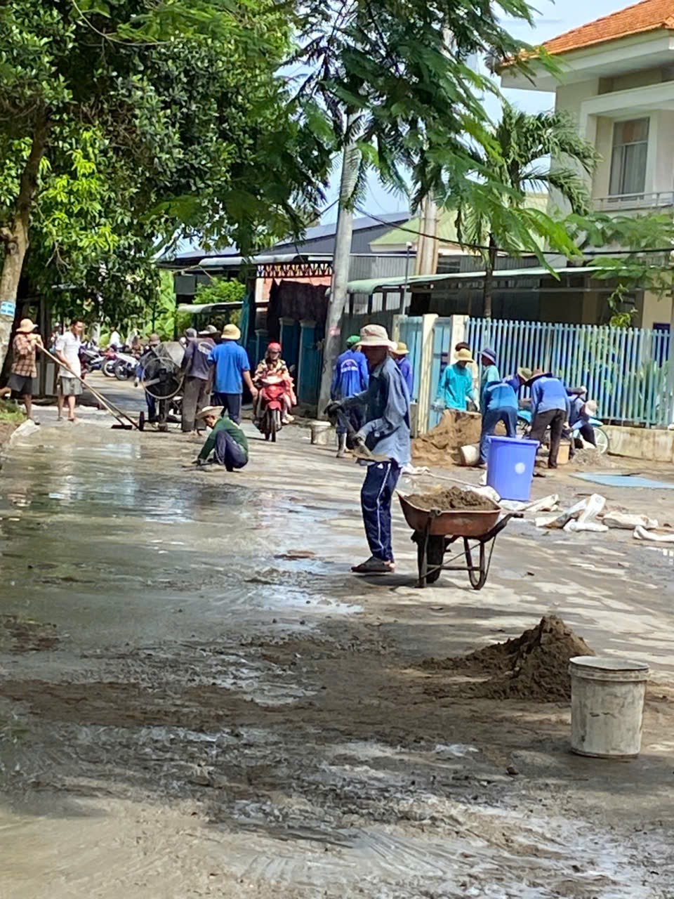 Nhân dân chung sức làm đường bê tông trước cổng Trường Tiểu học Nguyễn Hữu Cảnh