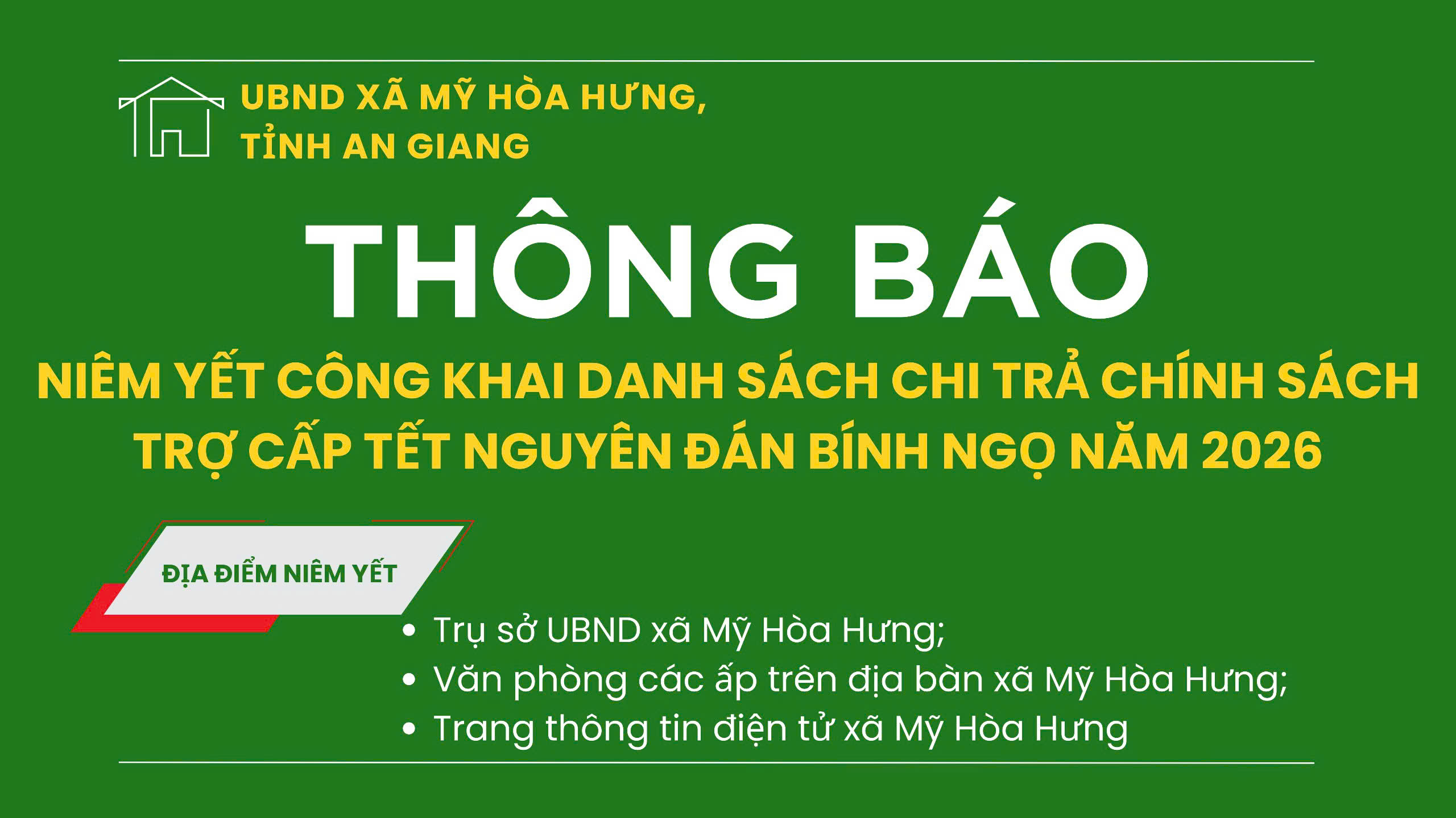 Niêm yết công khai Danh sách chi trả chính sách trợ cấp Tết Nguyên đán Bính Ngọ năm 2026 trên địa bàn xã Mỹ Hòa Hưng