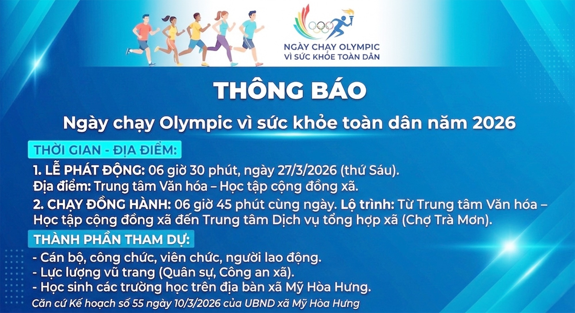 Căn cứ Kế hoạch số 55 ngày 10/3/2026 của UBND xã Mỹ Hòa Hưng về tổ chức Tháng hoạt động thể dục, thể thao cho mọi người giai đoạn 2026 – 2030, UBND xã thông báo tổ chức Lễ phát động Ngày chạy Olympic vì sức khỏe toàn dân năm 2026, cụ thể như sau: