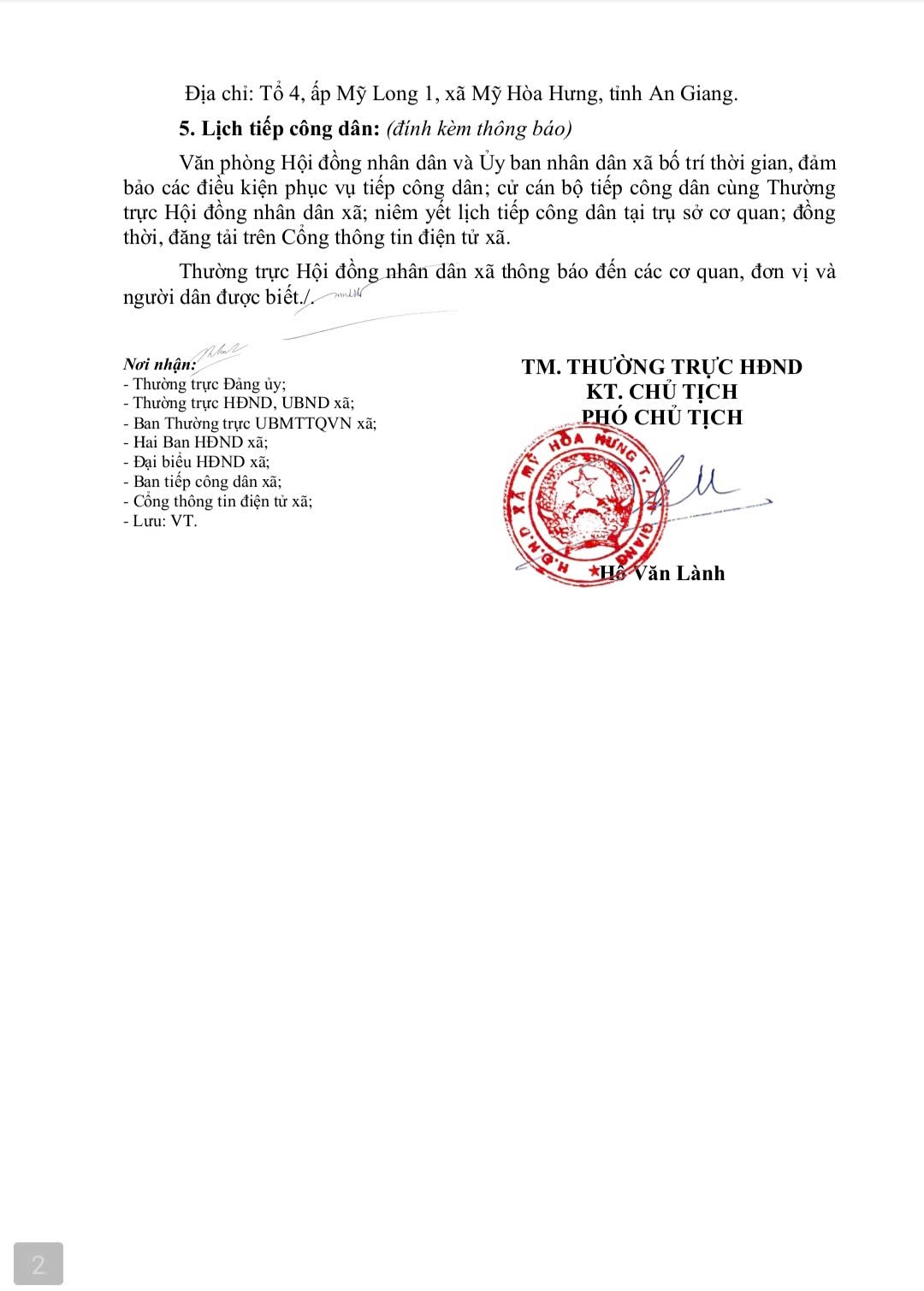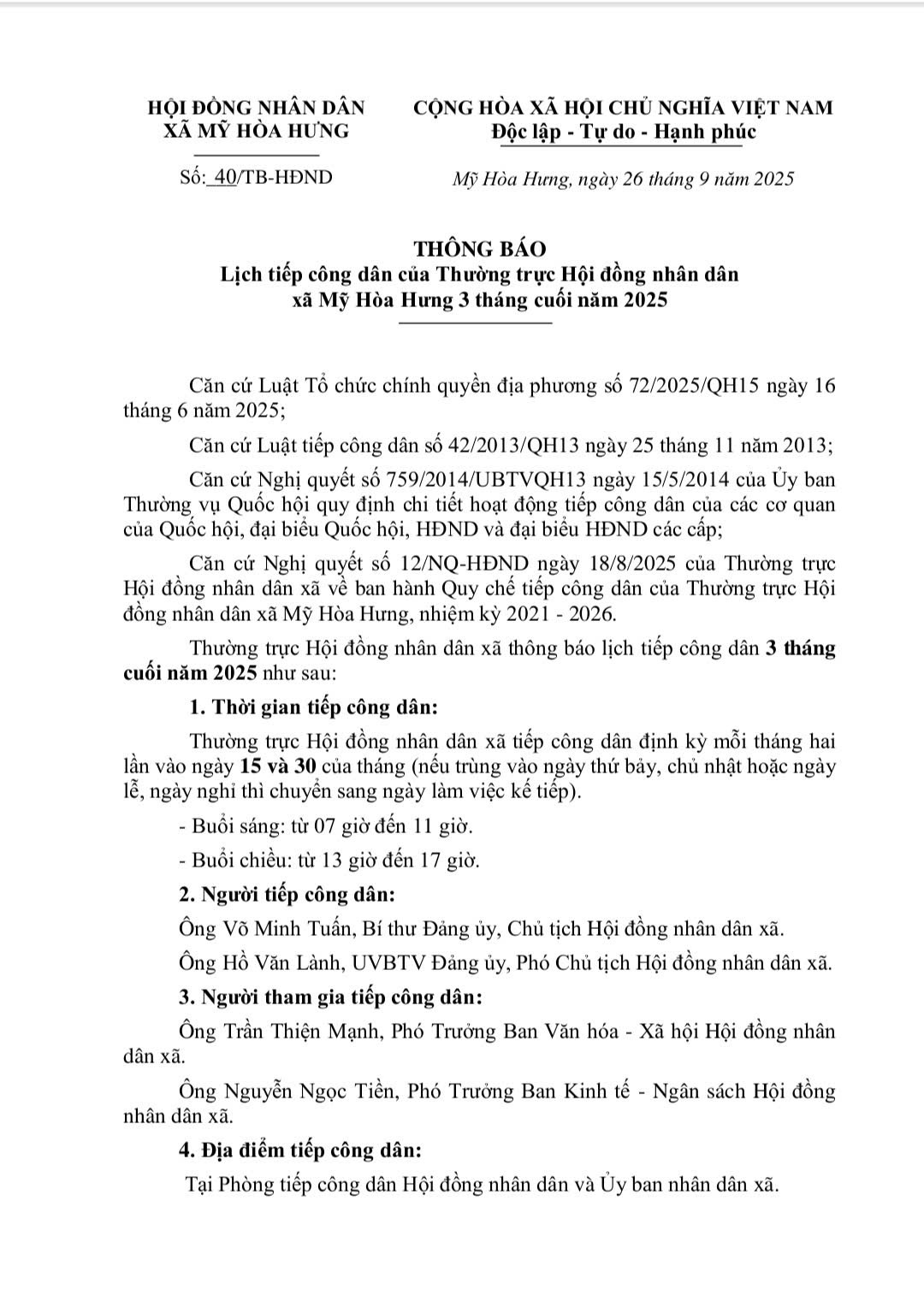 Thông báo lịch tiếp công dân của Thường trực HĐND xã Mỹ Hoà Hưng