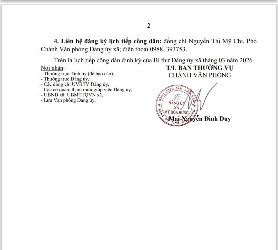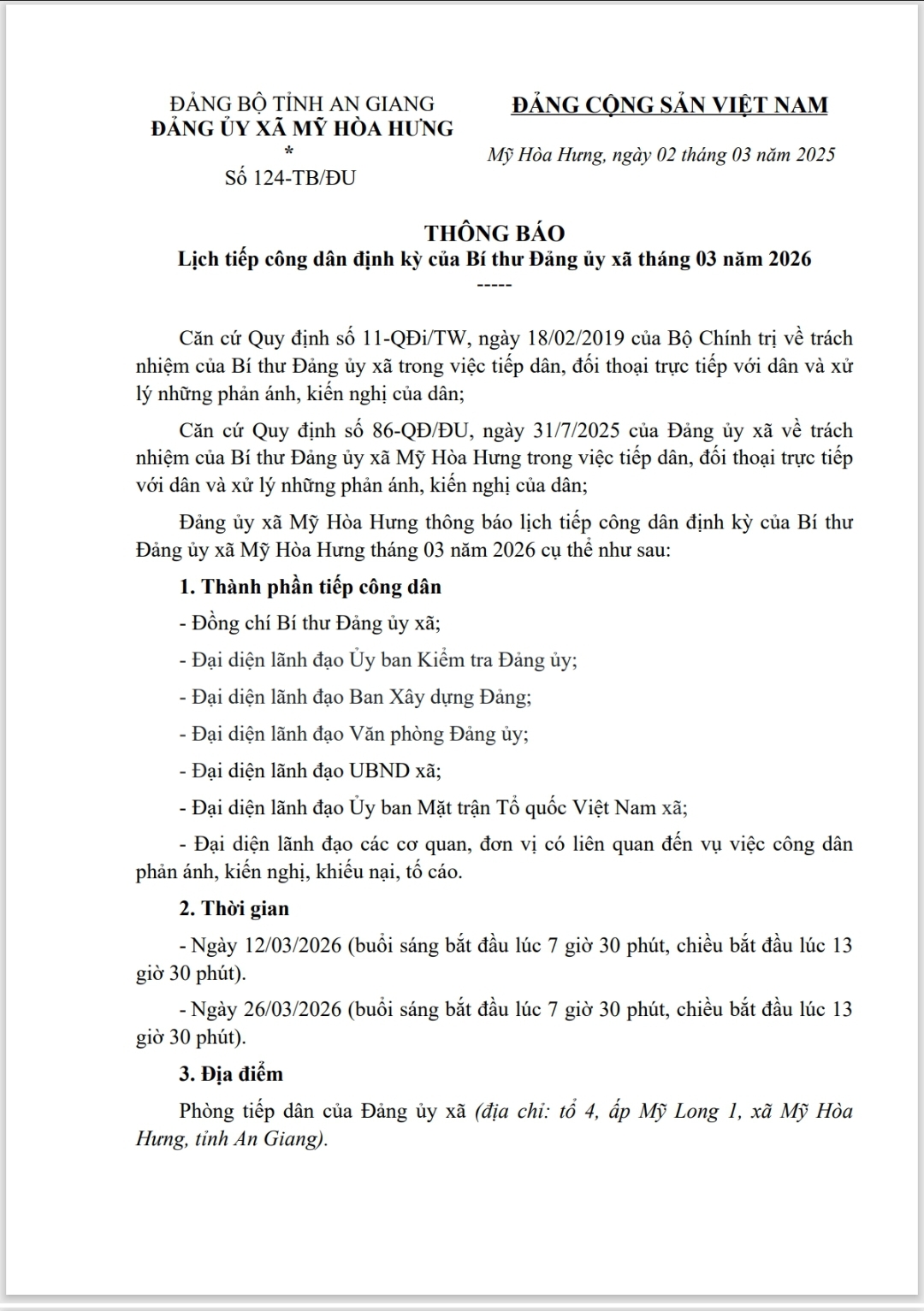 THÔNG BÁO Lịch tiếp công dân định kỳ của Bí thư Đảng ủy xã tháng 03 năm 2026