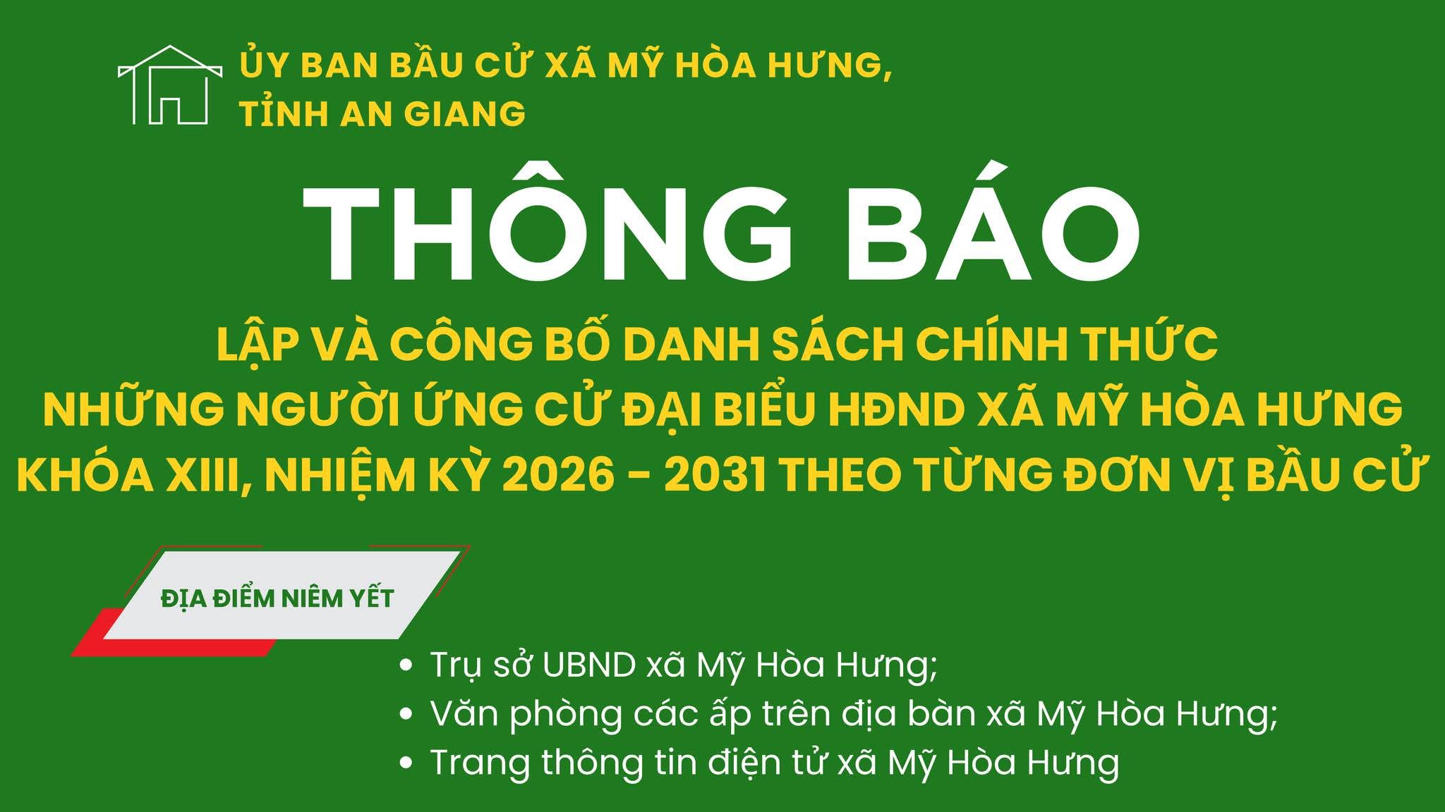 Ủy ban nhân dân xã Mỹ Hòa Hưng trân trọng thông báo đến toàn thể cử tri trên địa bàn xã: