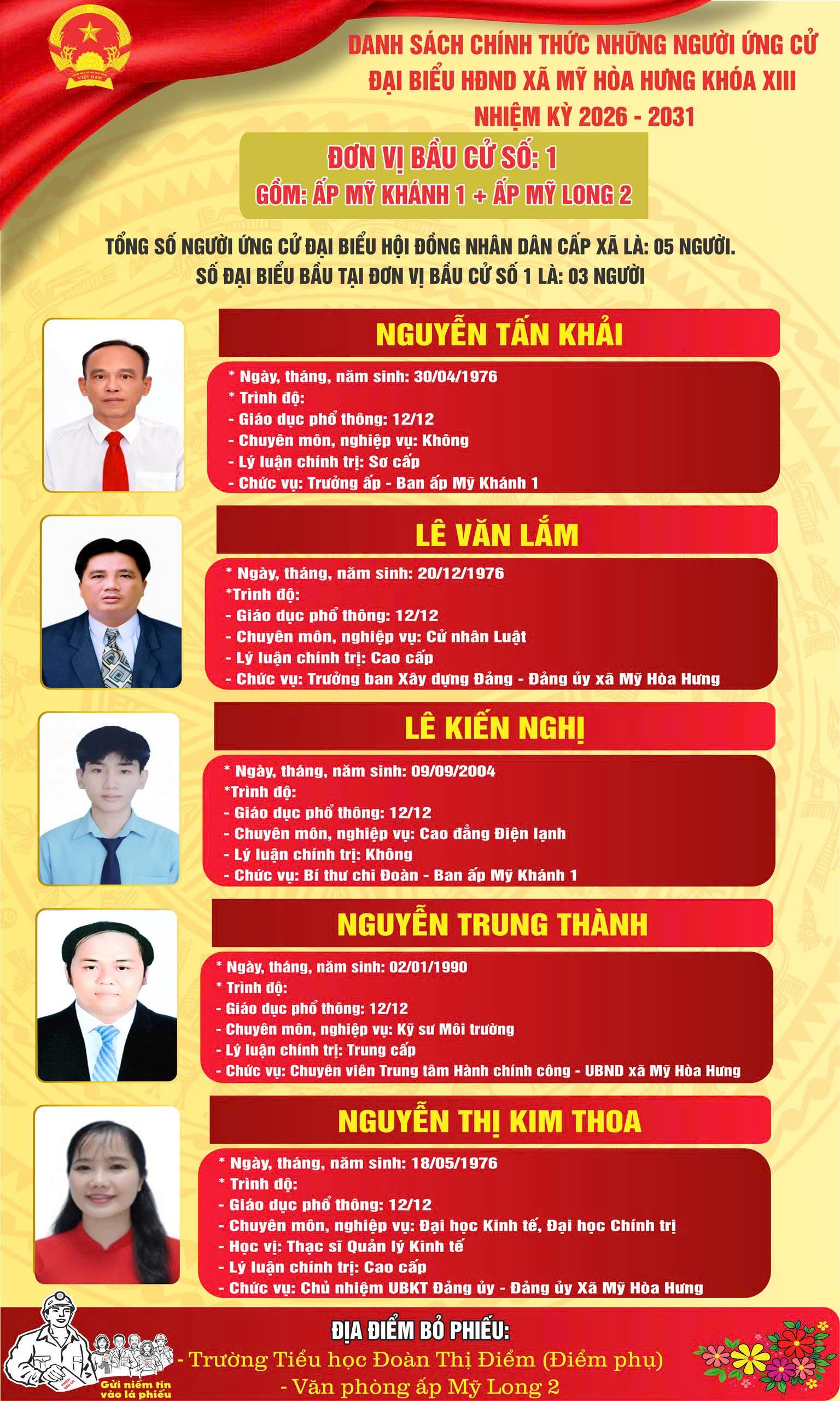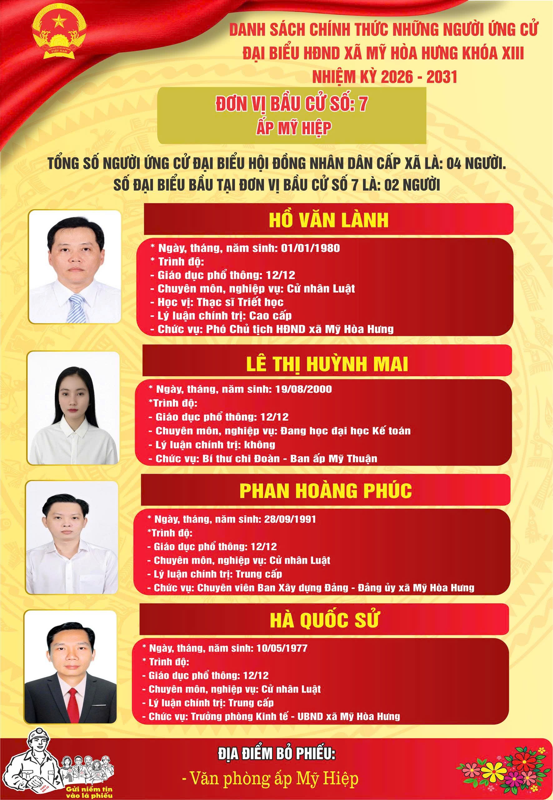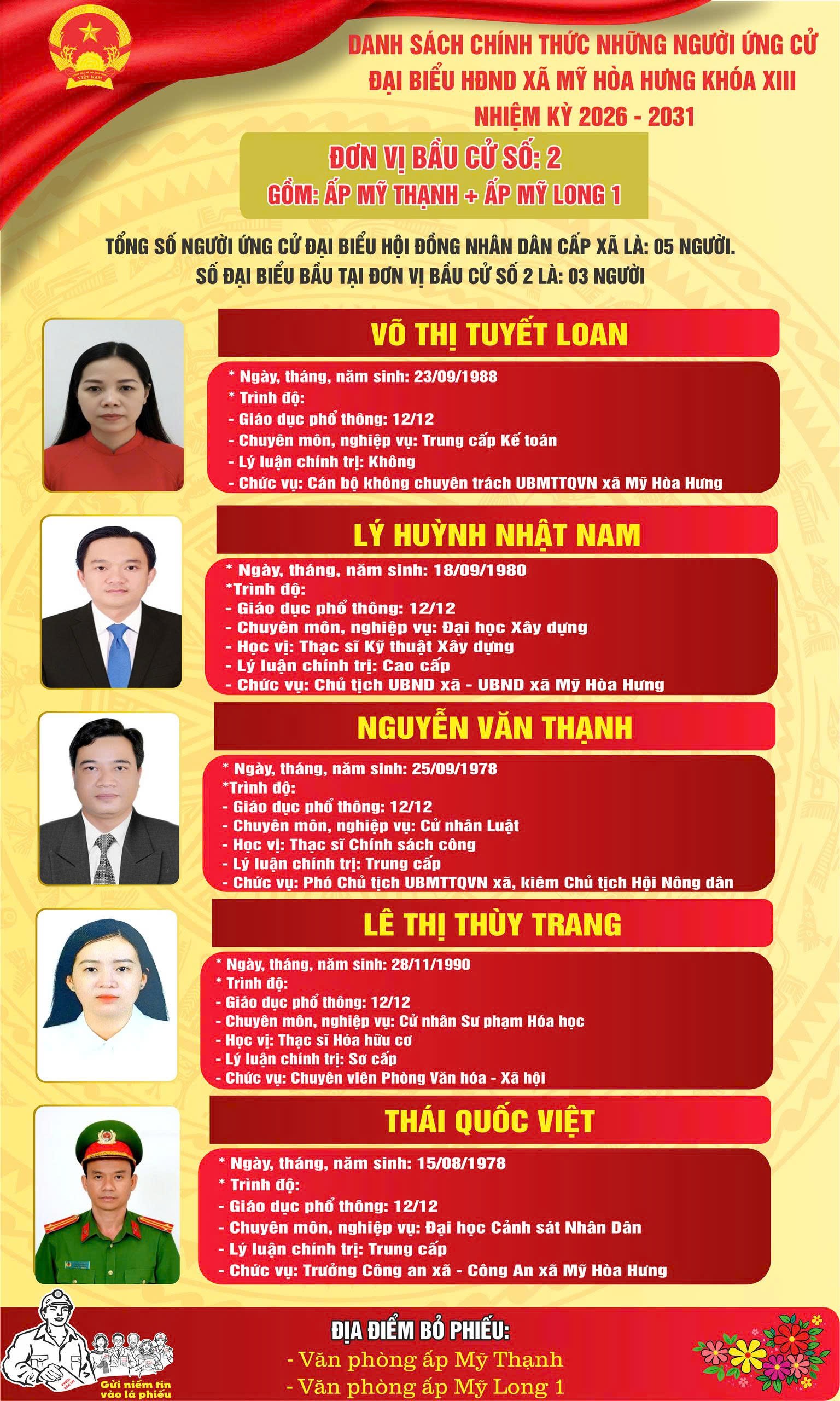 Danh sách chính thức những người ứng cử đại biểu Hội đồng nhân dân xã Mỹ Hòa Hưng khóa XIII, nhiệm kỳ 2026 – 2031 theo từng đơn vị bầu cử đã được niêm yết công khai tại các khu vực bỏ phiếu và đăng tải trên các phương tiện thông tin của địa phương.