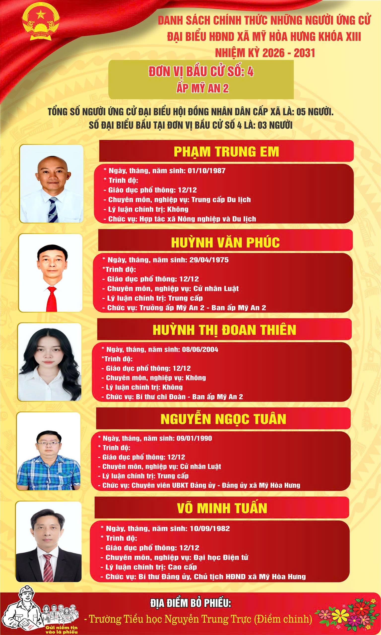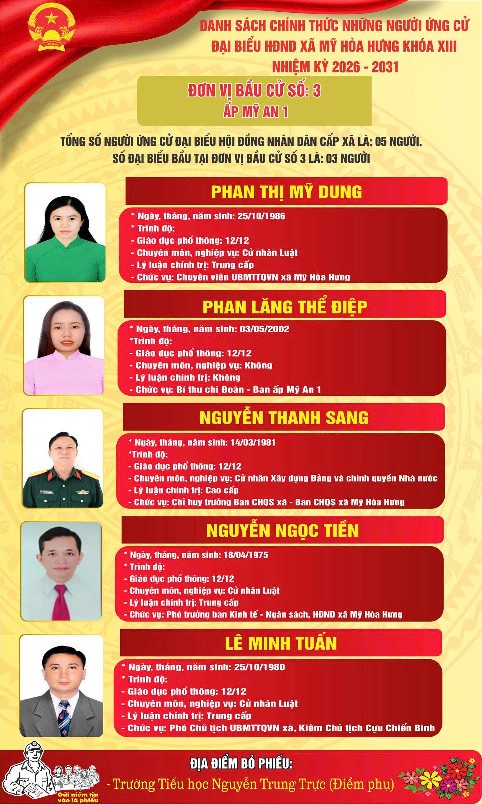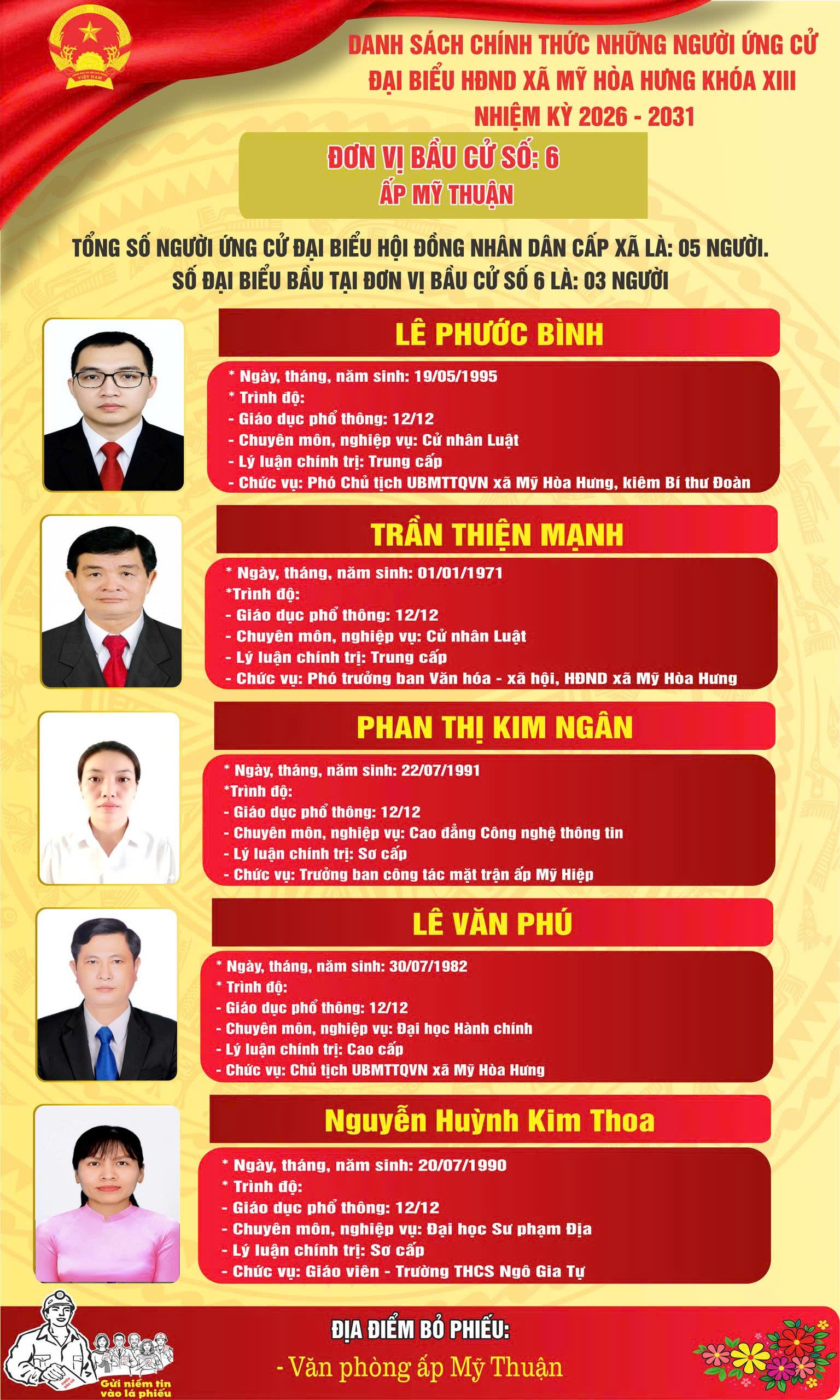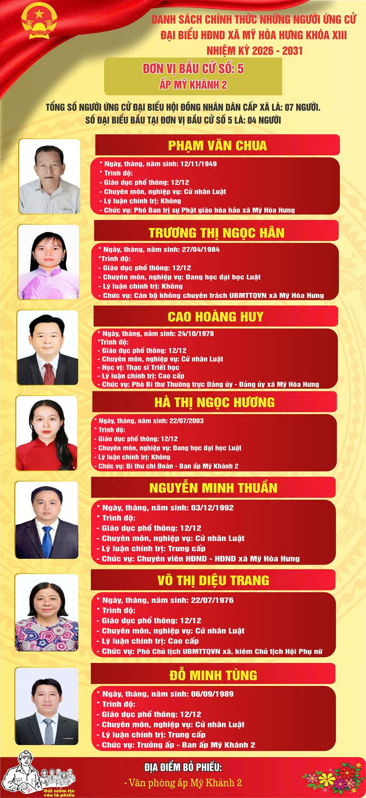 Danh sách chính thức những người ứng cử đại biểu Hội đồng nhân dân xã Mỹ Hòa Hưng khóa XIII, nhiệm kỳ 2026 – 2031 theo từng đơn vị bầu cử đã được niêm yết công khai tại các khu vực bỏ phiếu và đăng tải trên các phương tiện thông tin của địa phương.