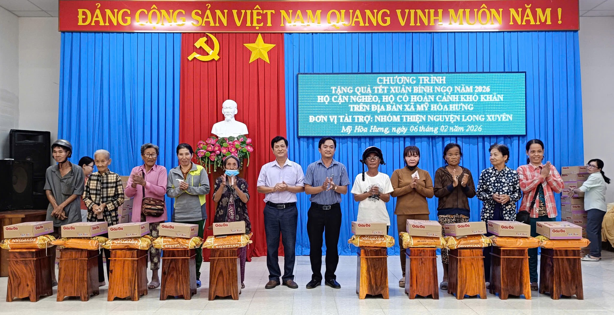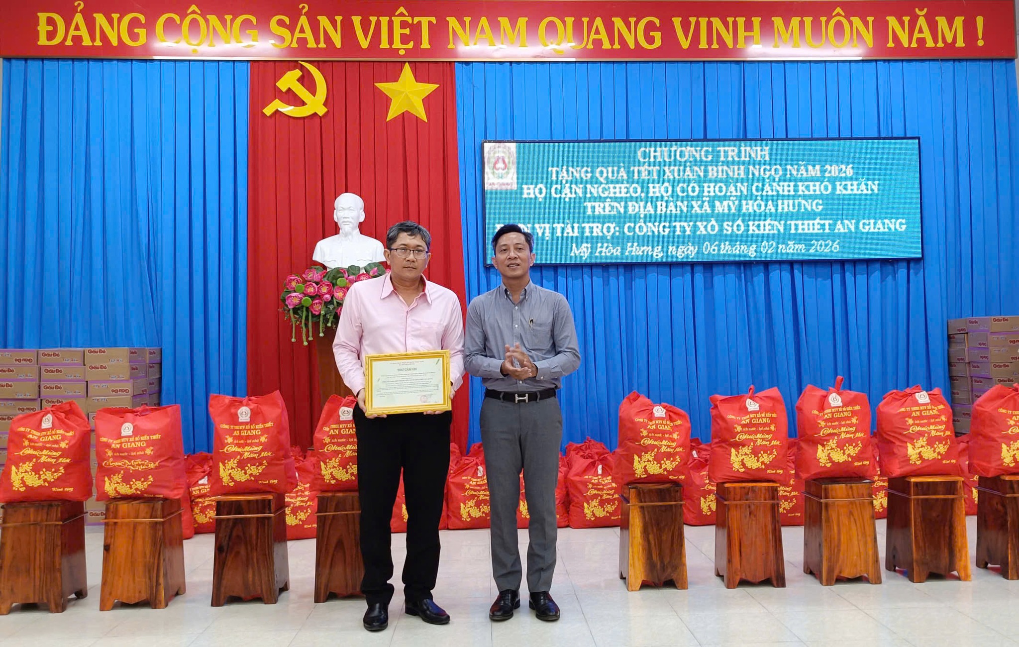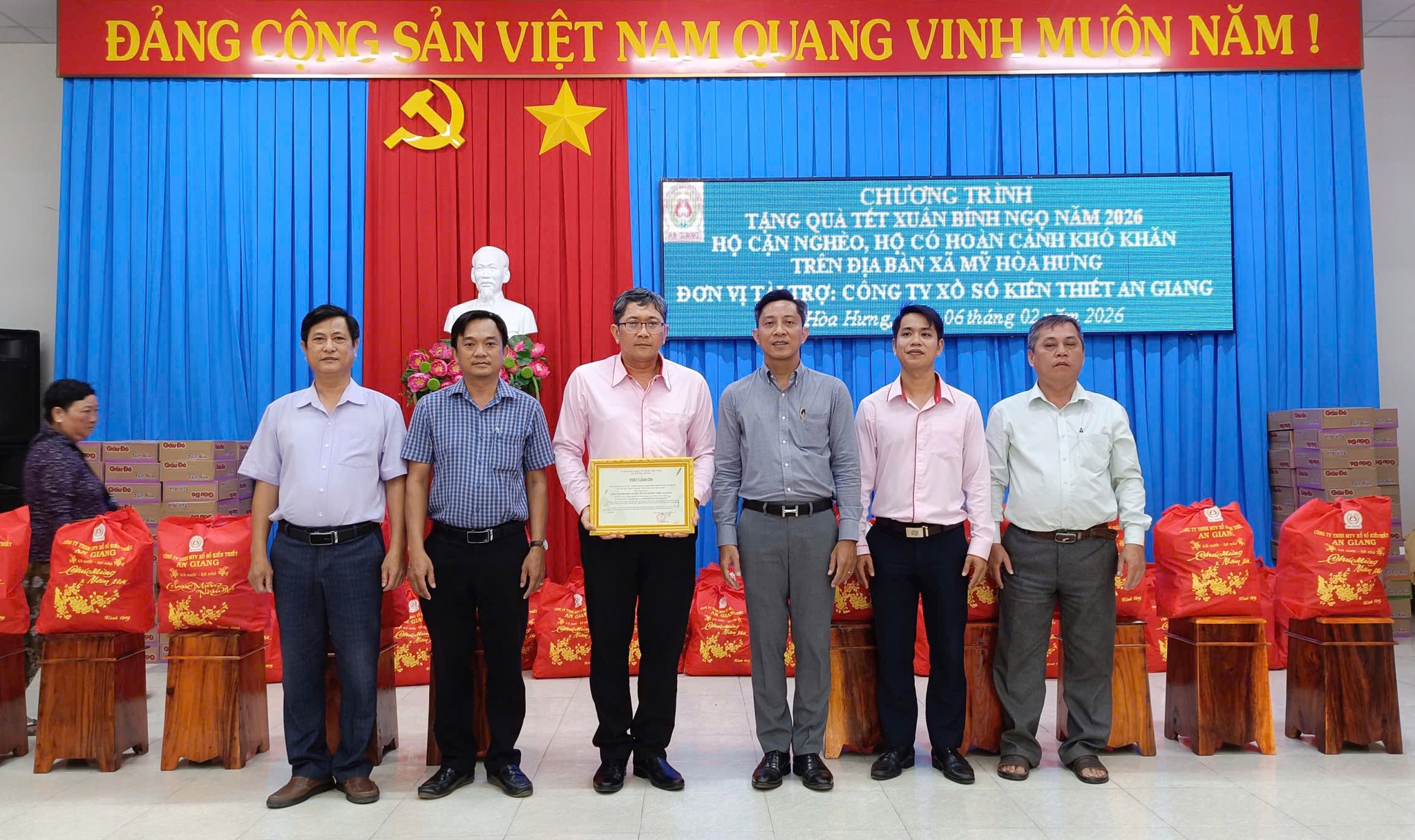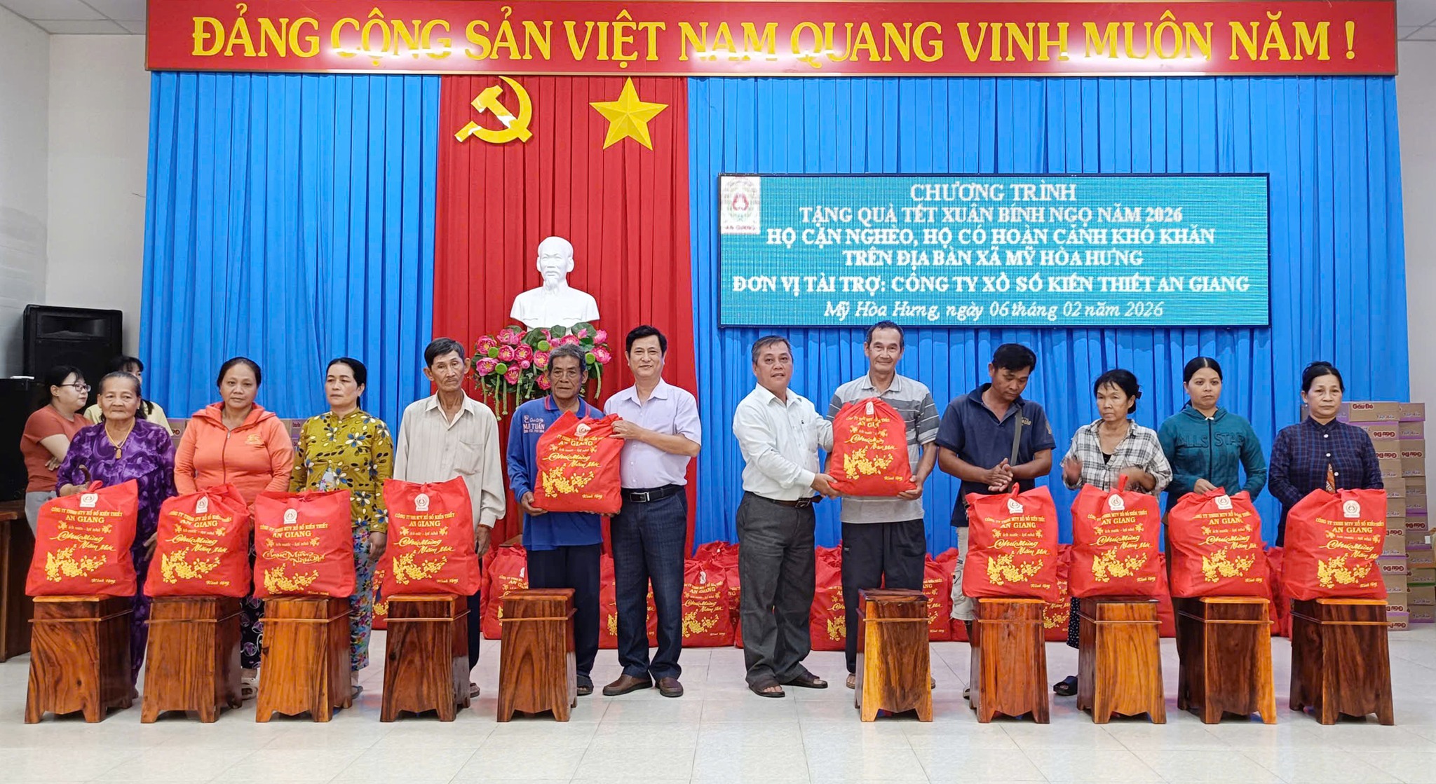 Chiều ngày 06/02, Ủy ban Mặt trận Tổ quốc Việt Nam xã Mỹ Hòa Hưng phối hợp với Công ty Xổ số Kiến thiết An Giang và Nhóm Thiện nguyện Long Xuyên tổ chức chương trình trao quà Tết Nguyên đán Bính Ngọ 2026 cho các hộ cận nghèo, hộ có hoàn cảnh khó khăn trên địa bàn xã. Đây là hoạt động thiết thực nhằm chăm lo đời sống vật chất, tinh thần cho người dân trong dịp Tết cổ truyền của dân tộc.