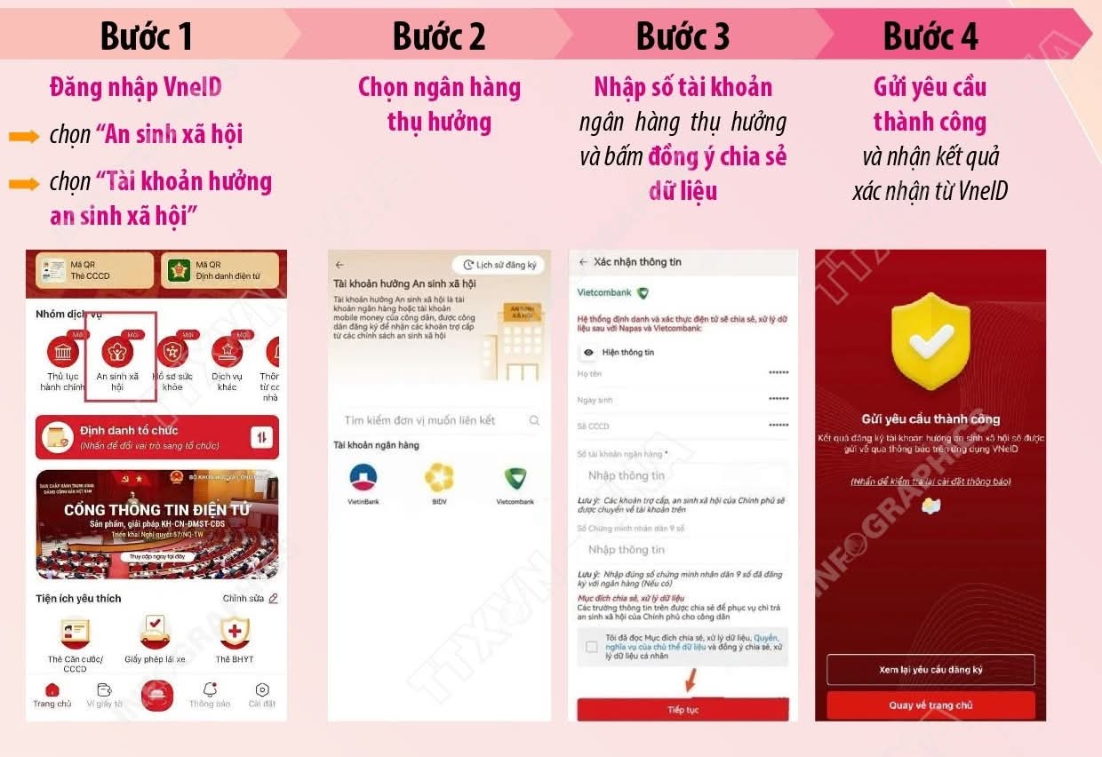 2.Đề nghị các hộ gia đình khẩn trương đăng ký và liên kết tài khoản cá nhân với Ngân hàng trên ứng dụng VNeID (mức 2) để việc chi trả được thuận lợi. Nên thực hiện vào sáng sớm hoặc buổi tối để tránh nghẽn mạng.