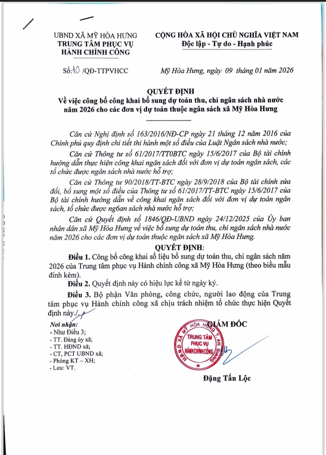 Về việc công bố công khai bổ sung dự toán thu, chi ngân sách nhà nước năm 2026 cho các đơn vị dự toán thuộc ngân sách xã Mỹ Hòa Hưng