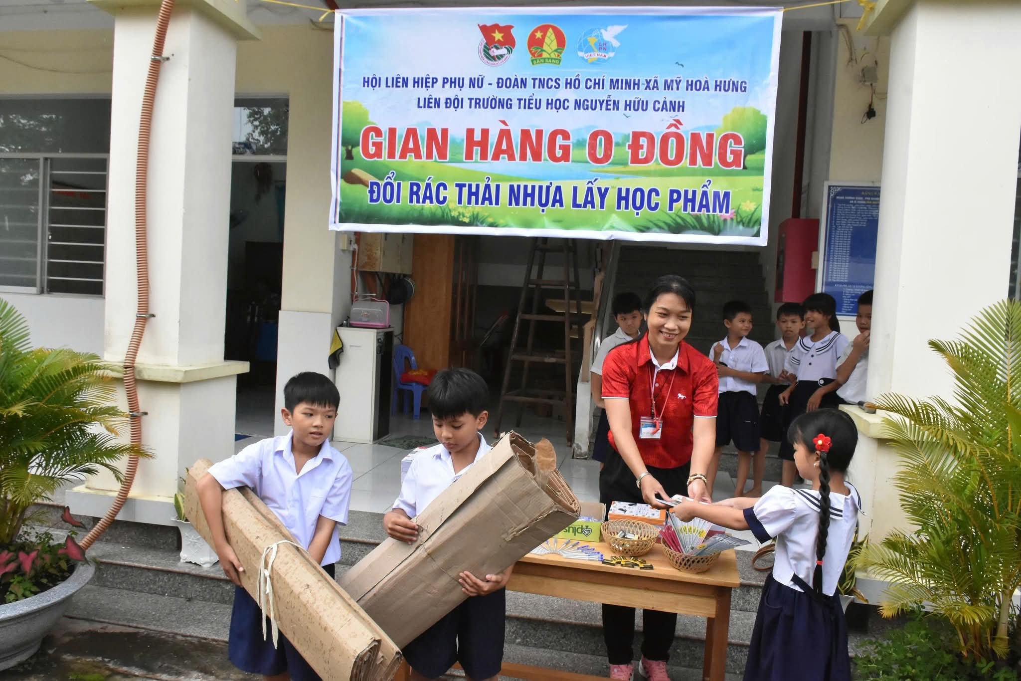 qua, tại Trường Tiểu học Nguyễn Hữu Cảnh (xã Mỹ Hòa Hưng, tỉnh An Giang), Đoàn Thanh niên Cộng sản Hồ Chí Minh xã Mỹ Hòa Hưng phối hợp với Hội Liên hiệp Phụ nữ xã và Liên đội Trường Tiểu học Nguyễn Hữu Cảnh tổ chức hoạt động “Gian hàng 0 đồng – Đổi rác thải nhựa lấy học phẩm”.