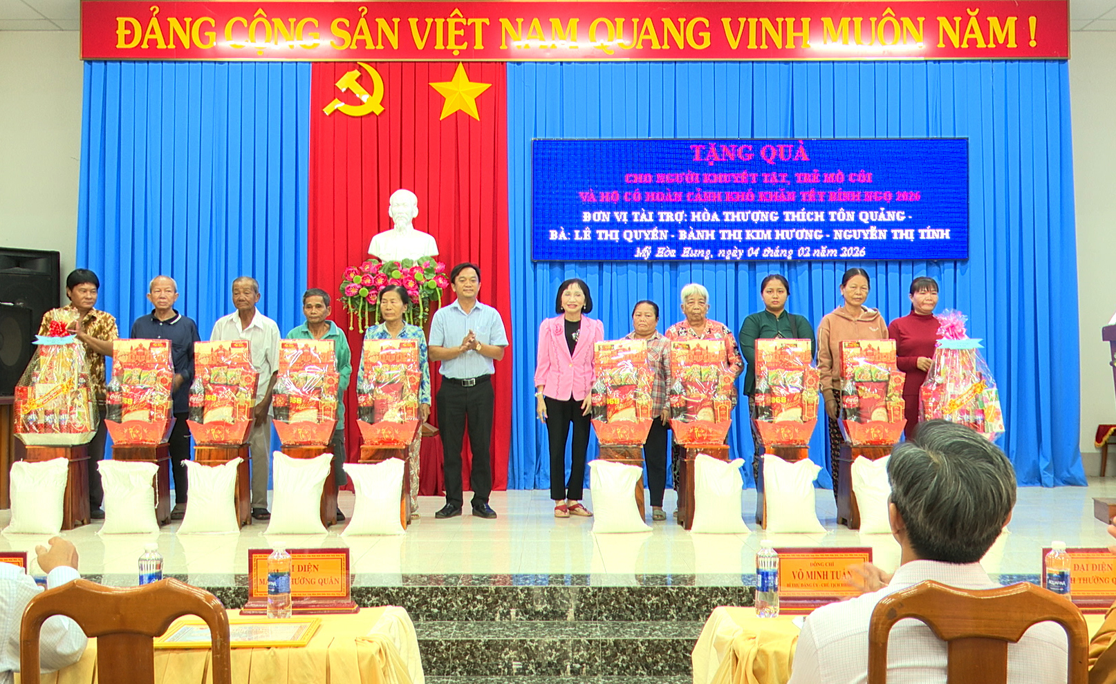 Nhân dịp Tết Nguyên đán Bính Ngọ năm 2026, sáng ngày 04/02, Ủy ban Mặt trận Tổ quốc Việt Nam xã Mỹ Hòa Hưng, tỉnh An Giang phối hợp với các mạnh thường quân trong và ngoài địa bàn tổ chức chương trình trao quà Tết cho người khuyết tật, trẻ mồ côi, hộ cận nghèo và hộ có hoàn cảnh khó khăn trên địa bàn.